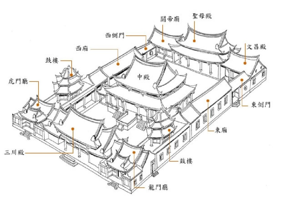 依照祭祀的神明不同,又可將殿堂細分為天上聖母殿、文昌帝君殿、華陀廳、關聖帝君殿、月老廳…等。