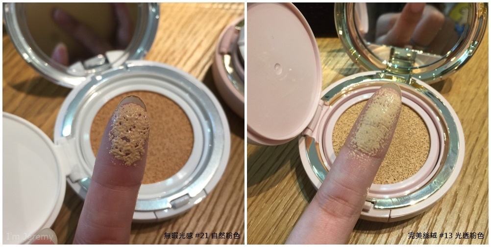 編仔當天試用的是 無瑕光感氣墊粉霜(白色外盒) #21自然粉色 與 完美絲絨氣墊粉霜(粉色外盒) #13光透粉色,從氣墊上看,兩者顏色看起來非常相近呢!