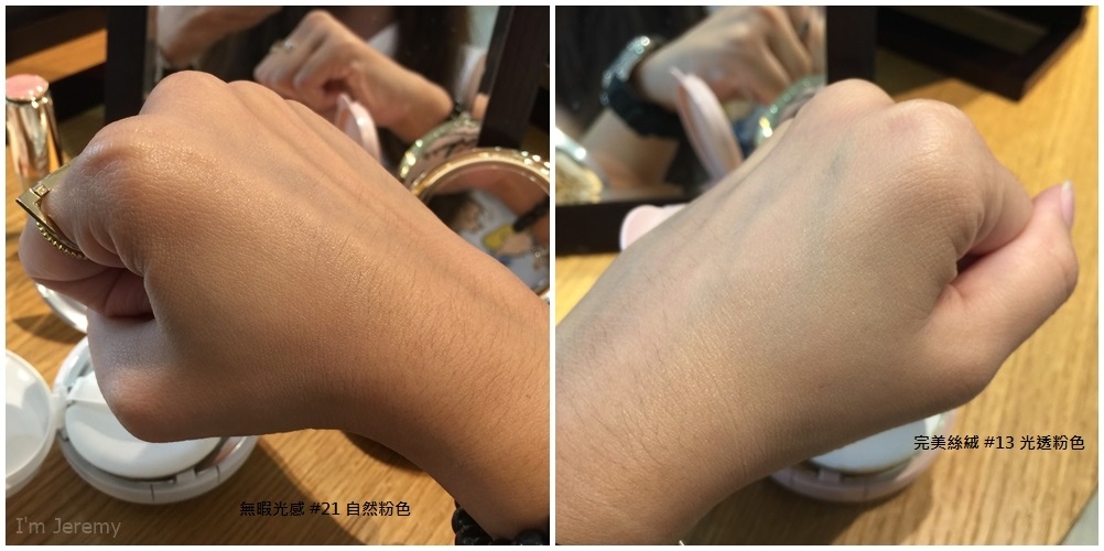 接著擦在手上比較,可以發現 無瑕光感氣墊粉霜(白色外盒) #21自然粉色 呈現半霧面感外顏色還剛剛好適合歐麥底的我,而呈現光澤感的 完美絲絨氣墊粉霜(粉色外盒) #13光透粉色 ,則比編仔的皮膚還亮一個色階。