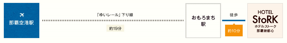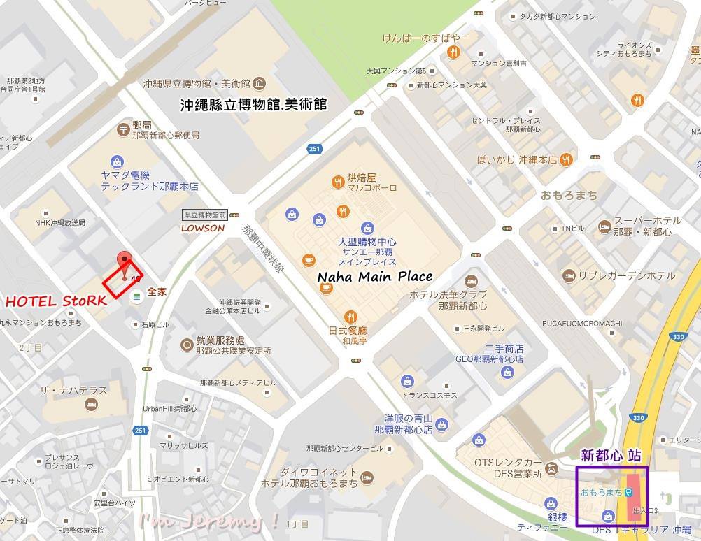地圖上,可以看到 HOTEL StoRK 位在沖繩單軌電車(日文:ゆいレール)的新都心站(日文:おもろまち駅、英文:Omoromachi)附近,