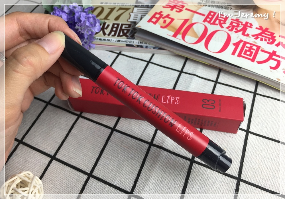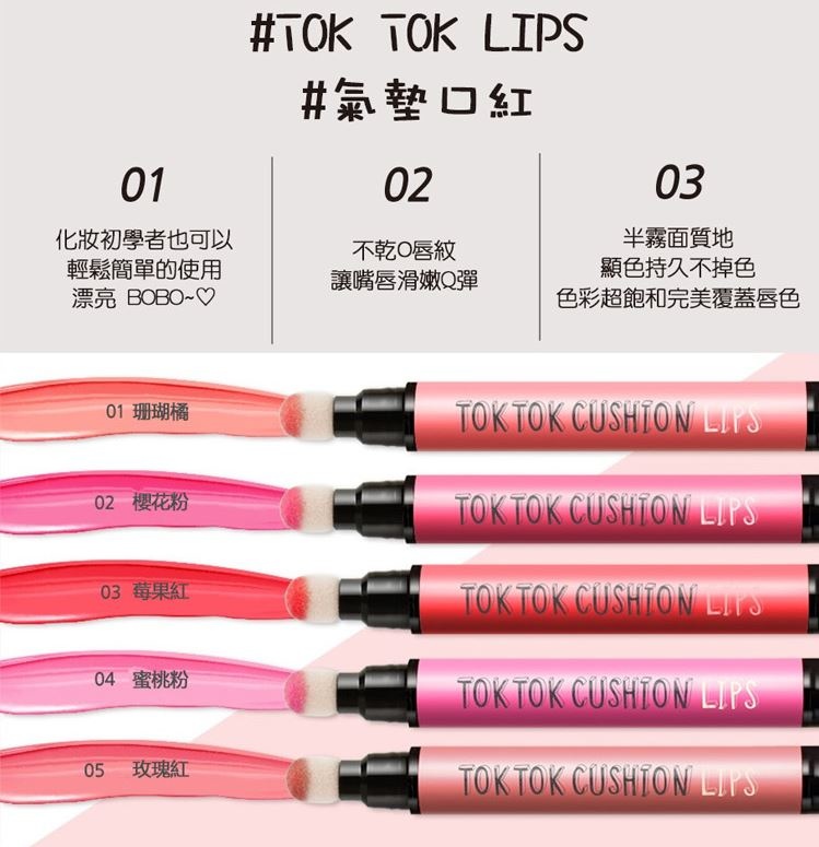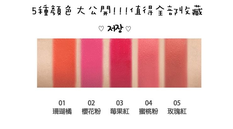 一共有5種顏色的 嘟嘟氣墊口紅筆 ,今天我使用的是色碼3號的「莓果紅」來為各位作介紹![]()