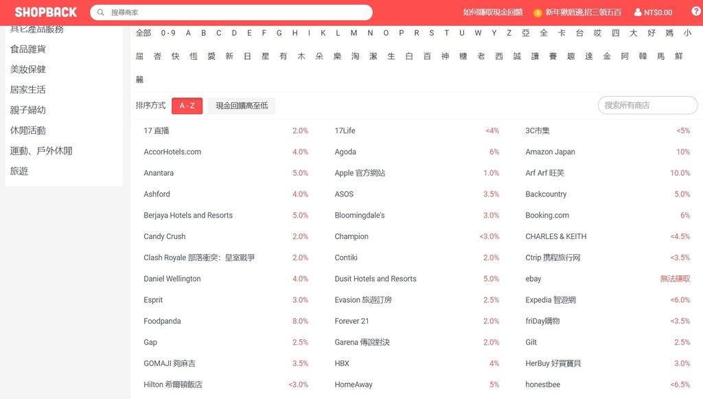 首頁上"熱門精選"有著我們熟悉的知名電商外,點進"查看所有熱門商家"還可以依字母或左邊分類尋找你想要的電商平台,