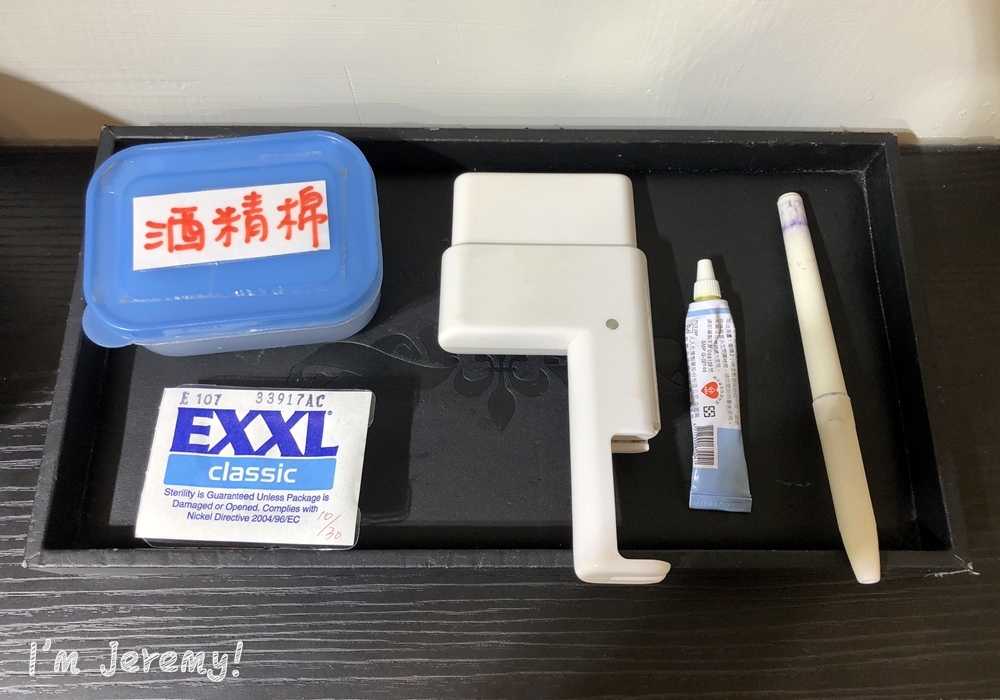 大口深呼吸,內心倒數3、2、1後,刺痛感伴隨著「喀」的一聲,耳環就已固定在碘酒筆上標記的位置了。