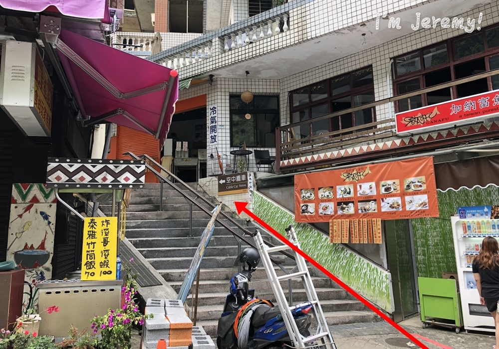 前往「雲仙樂園」的朋友,要記得從老街右邊樓梯往上搭乘「空中纜車」喔!
