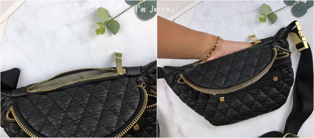 腰包整體使用黑色荔枝紋仿真皮面料製成,搭配整齊的菱格紋衍縫車工,