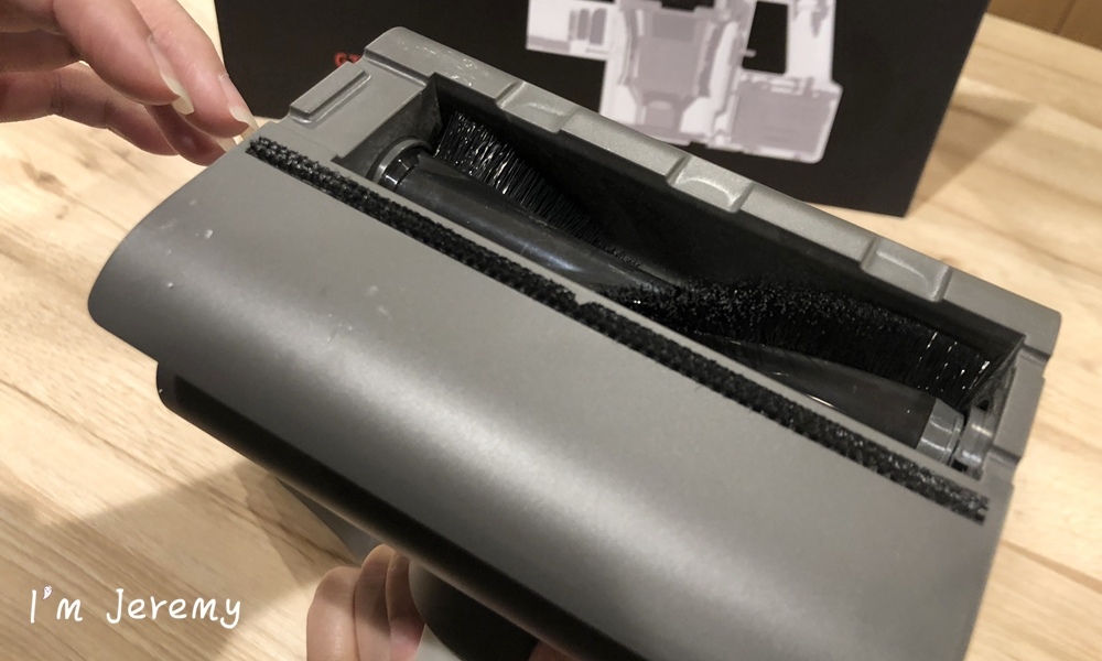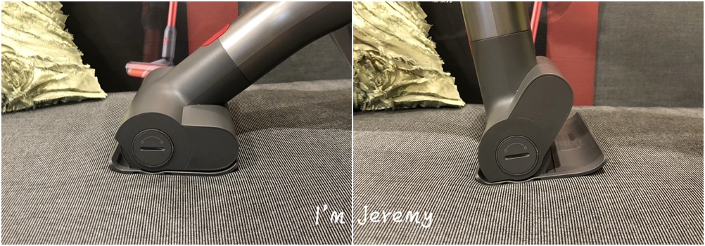 實際嚕了幾下沙發,發現它用起來還真不錯!!!不用擔心操機手勢讓機器發揮不了效果或要一直調整姿勢,可以順順的清理完軟墊。原因就在刷頭上,H6 是採一體成型,刷頭跟機子間沒有軟管,使操作不用一直抓角度(保持通道暢通),再者,刷頭有大幅度的移動輔助,能幫操作者克服一些手勢 + 角度問題。