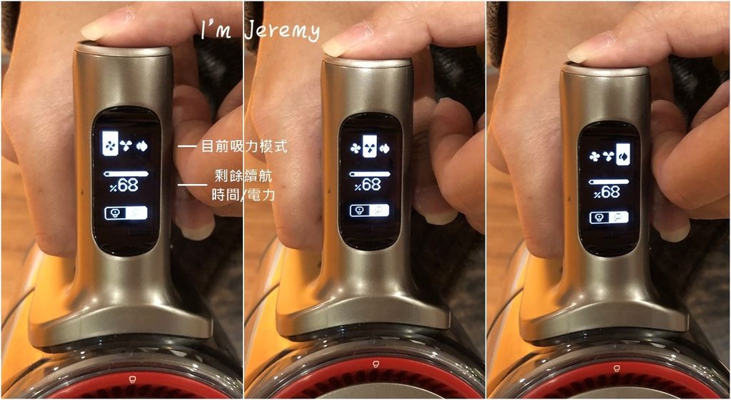 一共有 節能、均衡、強勁 三種吸力模式的 H6,使用時,中央電量顯示會改為剩餘續航時間 並倒數計時告訴你此模式還能操作多久,這設計還蠻新穎的,因為一般都只有說電量剩下多少,至於用多久就必須用猜的了 (摸下巴)