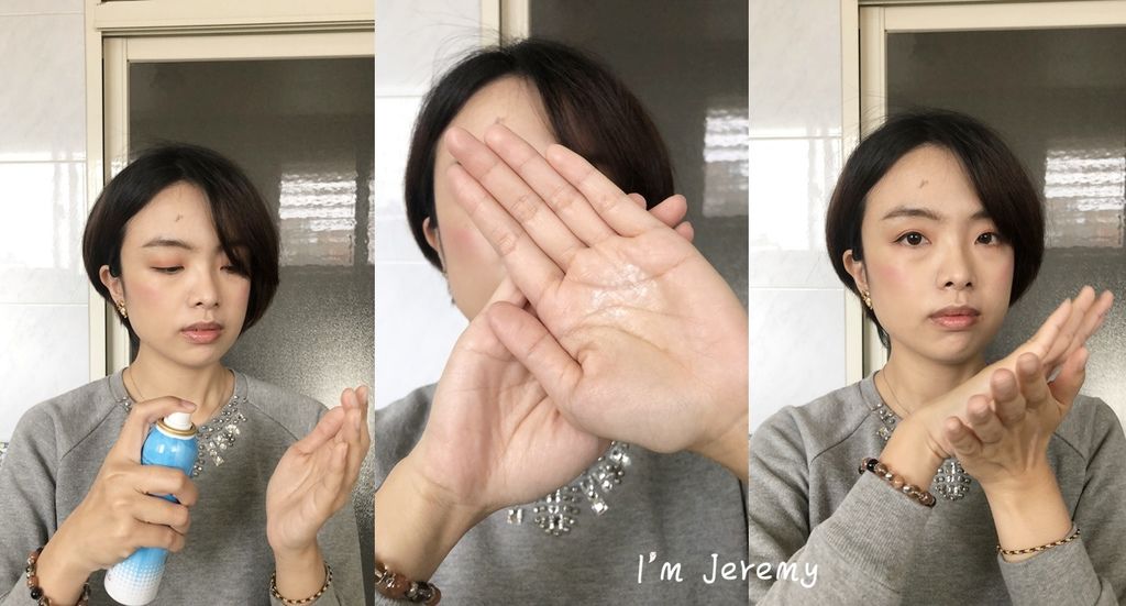 近距離噴灑時,質地會從原本透明霧狀聚集變成白色沫狀,別緊張 ~ 接著只要把它均勻推散就OK了。