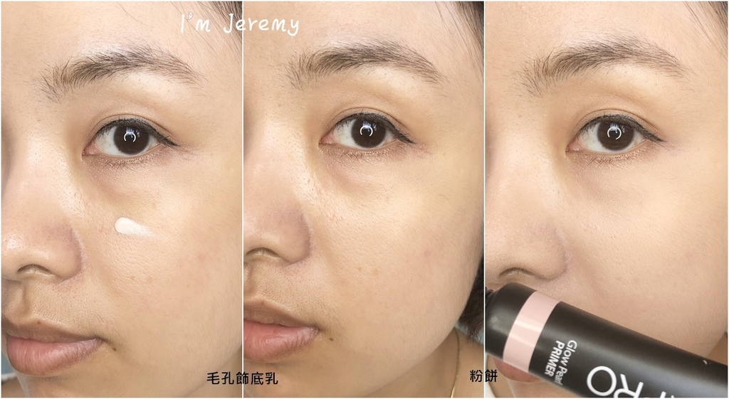 實際使用,肌膚近乎看不出來珠光的,但在疊上一層粉餅後,明顯看起來變得亮些,整個修飾肌膚,氣色看起來不錯,喔!對了,也增添臉部立體感!