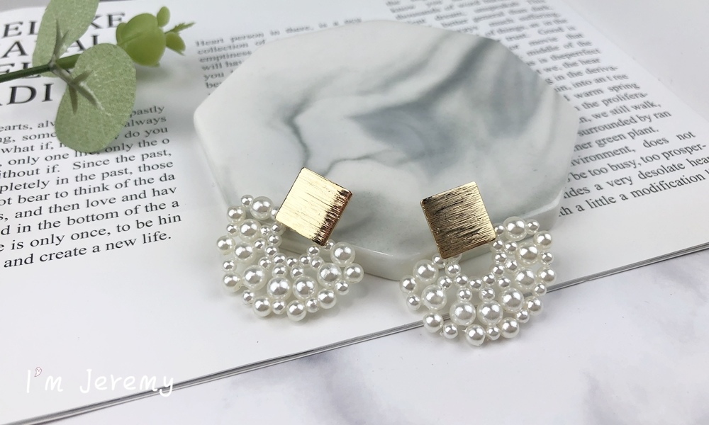 乍看很像極炸金針菇的珍珠饗宴,是我第一眼就決定入手的小夥伴。以大中小珍珠串成型的它,圖樣看起來頗具民族風情,搭配上橫紋金屬片,異材質的組合火花,成為它獨特風格的優點。