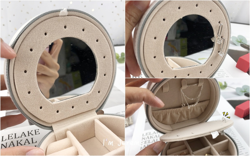 第二層 - 鏡子、耳環區:鏡子周圍的洞孔,可存放針 & 耳勾式的耳飾,但記得針式的飾品,要拴上扣子唷!不然會一直掉。