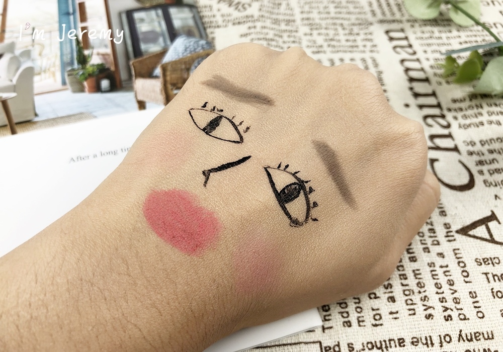 花子醬臉上的化妝品依序為 - 粉底液、防水眼線膠、眉筆、唇膏、腮紅。