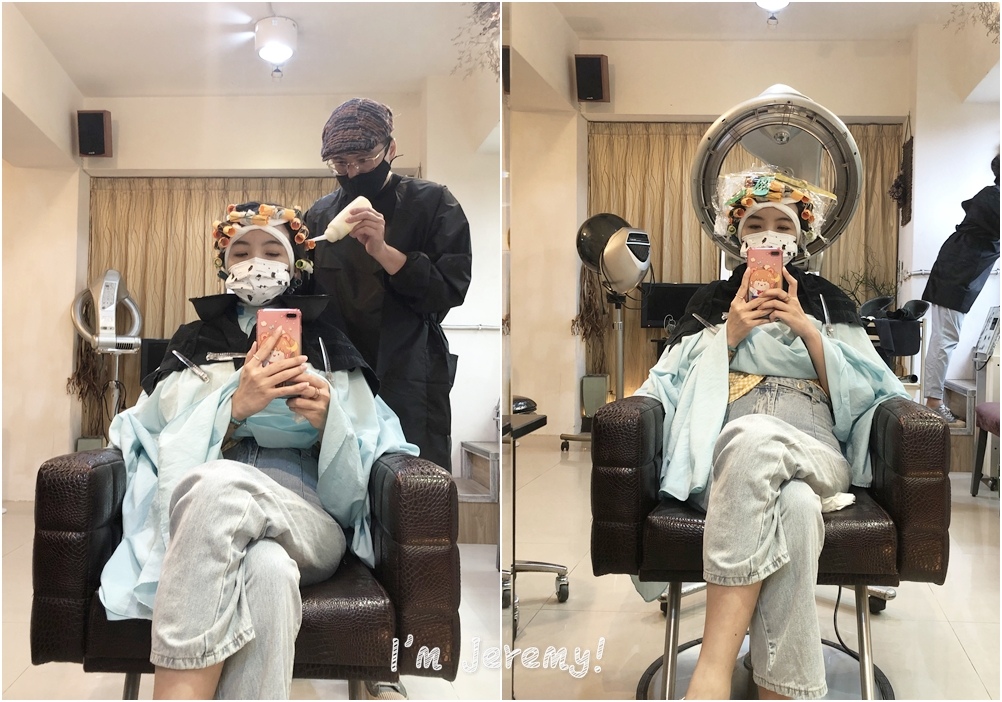 接著,kevin 著手進行燙髮 ~ 只見他動作熟練快速的將髮捲一個個捲上髮尾 → 固定,完成後,看起來很像要燙整頭吧!但其實今日咱只燙髮尾啦 ~ 架好捲子與一切裝備 → 點上一劑藥水後,準備開始燙髮,GO ~