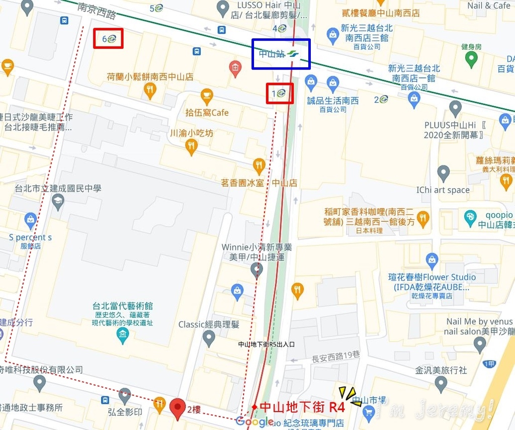 從 6 號出口出往當代藝術館方向走,或由 1 號出口出沿捷運裝置藝術往後走(經茗香果園冰室),皆可抵達!如果頭上天氣不太理想(ex.烈日),便可從 " 中山地下街 " R4 出口出,目標即在斜斜對角。