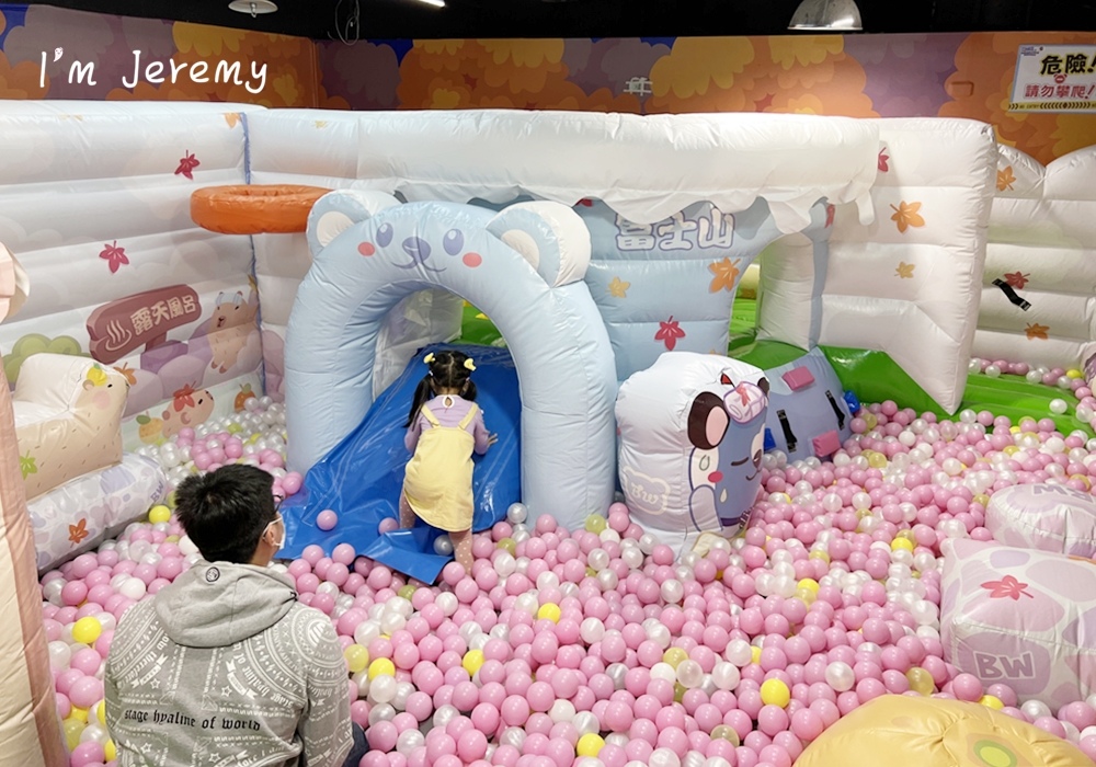 穿越竹林挑戰後,我們來到富士山遊玩,陡峭的山坡變成了好玩的溜滑梯,小朋友們可以輕鬆達成登頂的任務外,也能一股溜進球池中體驗與水豚先生泡澡的樂趣。