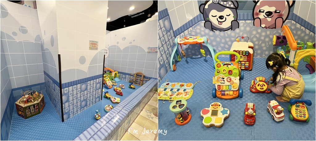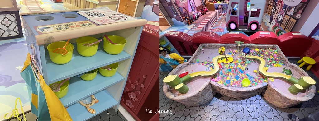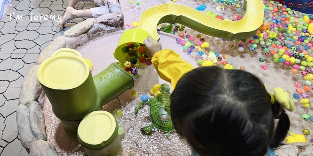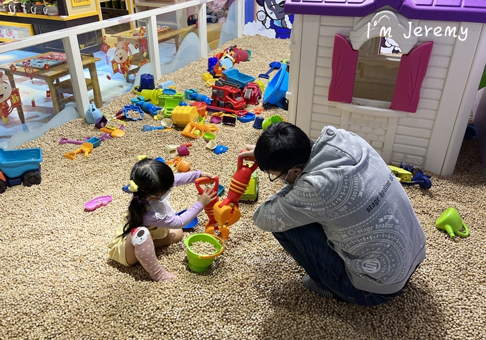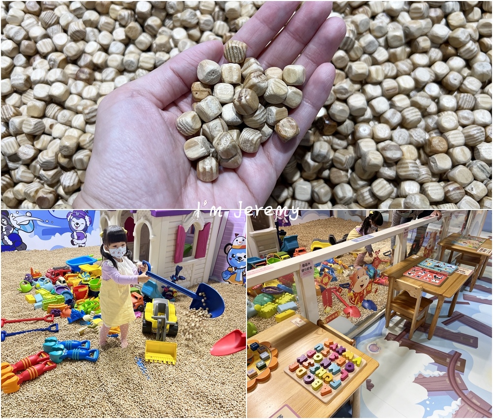 雖說是沙坑,但其實館內是採木粒沙為使用。省去清理細沙煩惱,也不用擔心它掉的館內到處都是,還可以滿足觸覺刺激發展,沒錯 ~ 大朋友的腳也是 (笑) 此外,沙坑周圍有擺放些學齡玩具供使用喔。
