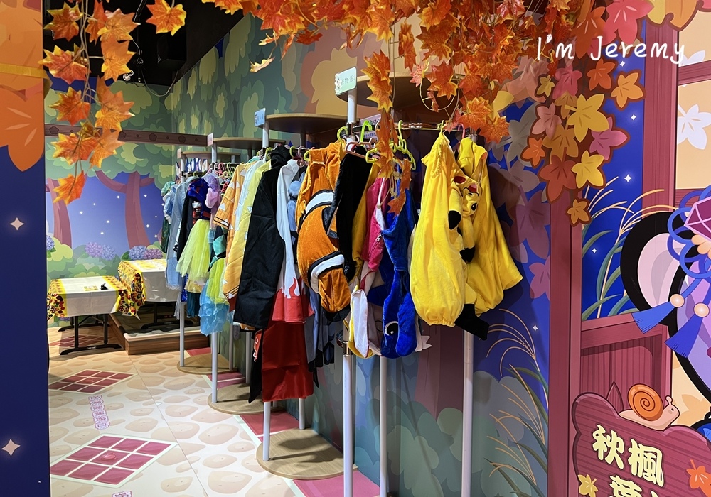 ↑楓鈴妝點徑(變裝間)。走進隱藏在舞台後方的小空間中,挑選喜歡的角色服裝邊身吧!今天你想變身成為誰呢?動物、公主、鬼殺隊、火影忍者...等都可以喔 ~